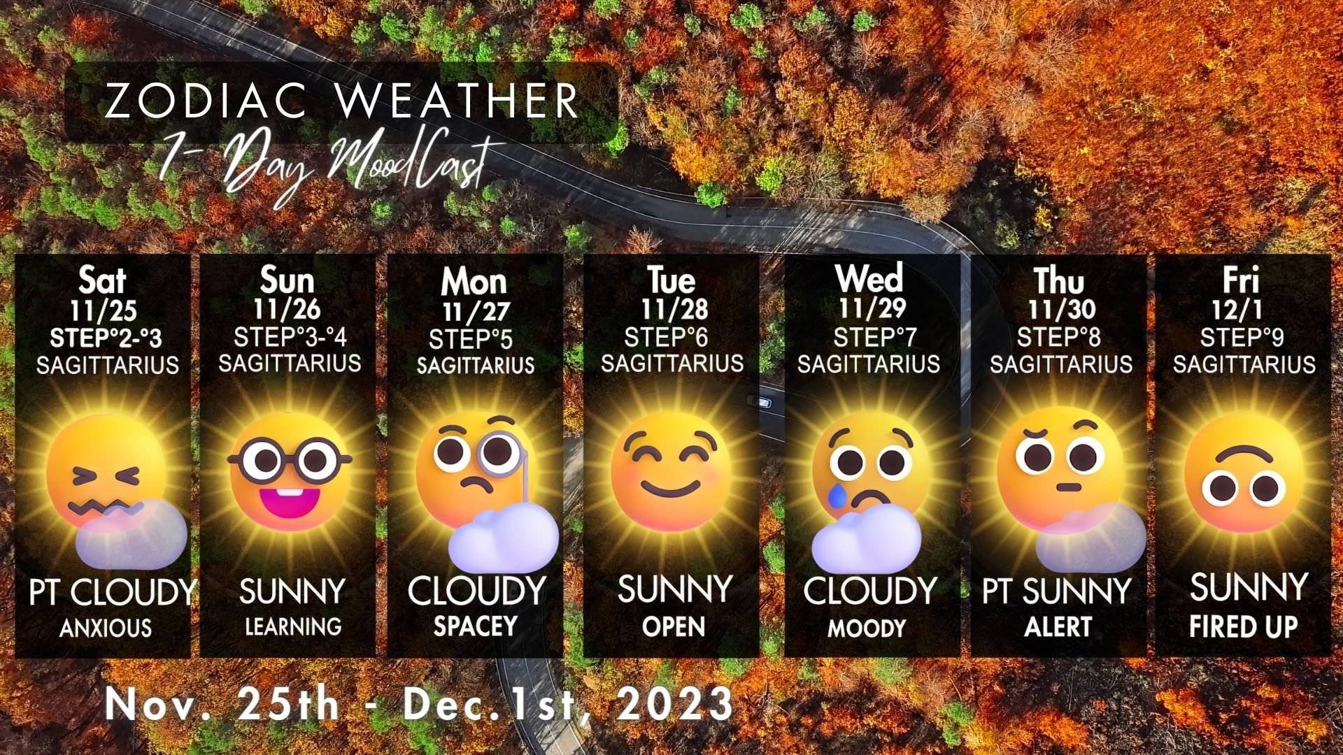 🌟ZODIAC WEATHER REPORT WEEKLY MOODcast w/ Christopher Witecki @SiriusJoyTV Nov 25th – Dec 1st, 2023 Key Question: What Must I Think About Myself? This Week: A Full Moon in Gemini jolts your thinking about yourself. The karma is behind you, and the inner narrative must change. Consider this week a self-induced brain washing to clear thinking that no longer applies. The byproduct? A new story about yourself moves into motion. Week Ahead Forecast: You are kickstarting some sort of life changing transforming. Reflect on what you believe about yourself. 😊 Tuesday 11/28: